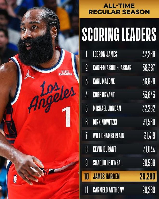 在本场比赛赛前,哈登距离卡梅隆-安东尼仅差21分,如超越他将升至历史总得分榜第十位。最终哈登全场砍下34分,完成了这一里程碑。