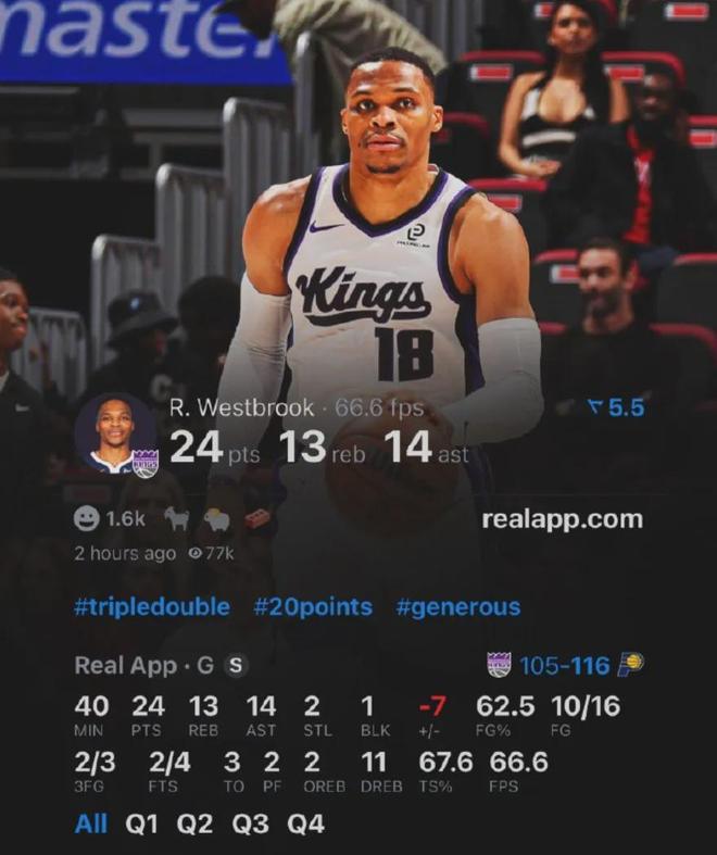 国王最终以105比116输给步行者,但威少爷拼到了最后,他轰下24分13篮板14助攻2抢断1封盖的数据,出现3次失误瑕不掩瑜。